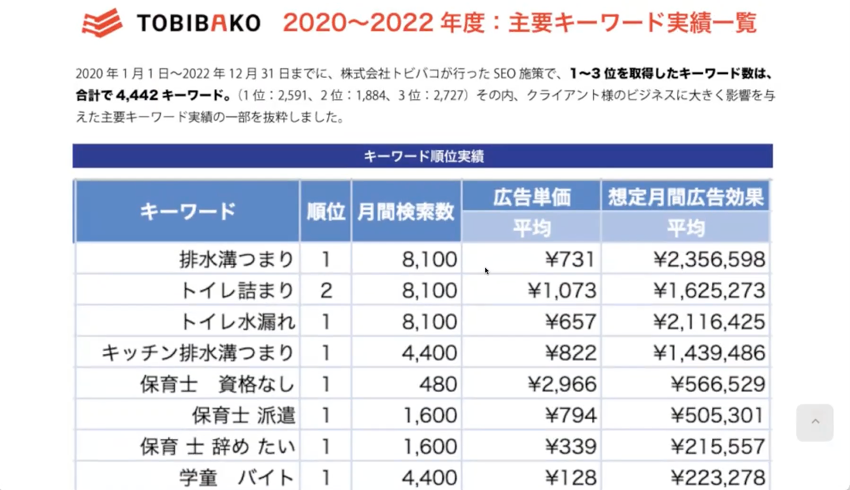 これまで上位表示できたキーワードを一覧化し広告換算効果を試算。結果、強烈な実績訴求資料に